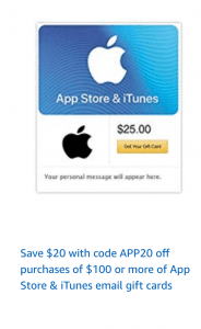 - $100 iTunes e-gift for $80 with promo code APP20Â