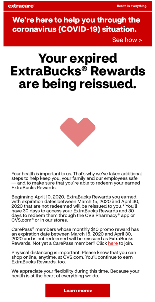 CVS has sent out an e-mail to members who have had their extracare rewards expire stating that they will be reissued. Starting April 10th rewards with an expiry date between March 15th and April 30th will be reissued and you’ll have an additional 30 days to redeem them. CarePass rewards are also being extended.