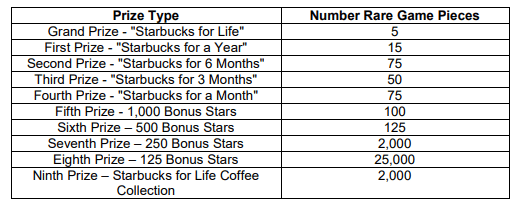 SIXTEENTH PRIZES: Fifty (50) Bonus Stars which will be automatically added to their Starbucks Rewardsâ„¢ account used to register for the Promotion. ARV: $1.90. ONE MILLION TWO HUNDRED EIGHTY-NINE THOUSAND FOUR HUNDRED SEVENTY-FIVE (1,289,475) SEVENTEENTH PRIZES: Ten (10) Bonus Stars which will be automatically added to their Starbucks Rewardsâ„¢ account used to register for the Promotion. ARV: $0.38.
