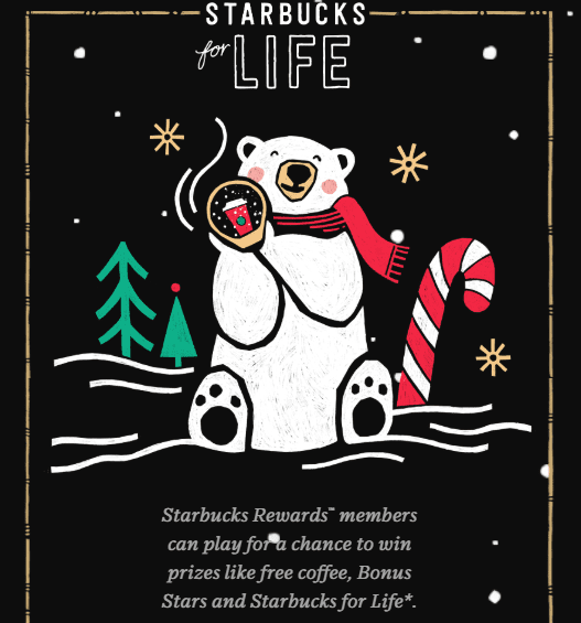 - Starbucks has launched their 2018 holiday promotion called ‘Starbucks for Life’. Starbucks Rewards users can enter in two ways: