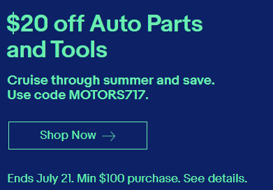 - eBay is offering $20 off Auto Parts and Tools when you use the promo code MOTORS717. Minimum purchase of $100 and expires July 21st, 2017