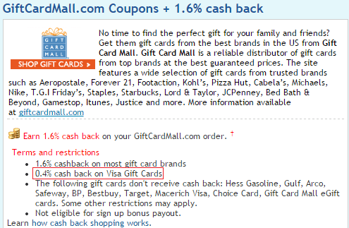 - Receive 0.4% cash back when you purchase Visa gift cards from Giftcardmall when you use the shopping portal Simply Best Coupons