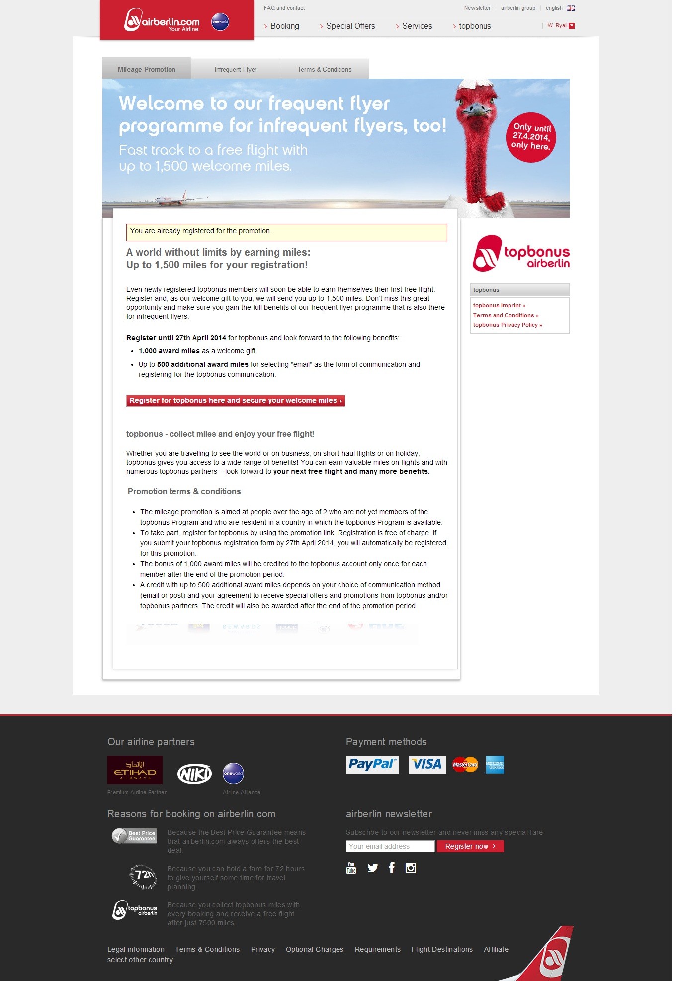- Receive 1,000 miles for joining airberlin’s topbonus loyalty program