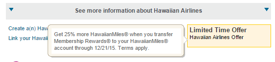 - Receive a 25% transfer bonus when you transfer American Express Membership Rewards points to Hawaiian Airlines HawaiianMiles. The standard rate is 1:1, so this means it would be 1:1.25. So if you transfer 1,000 Membership Rewards you’d receive 1,250 HawaiianMiles.