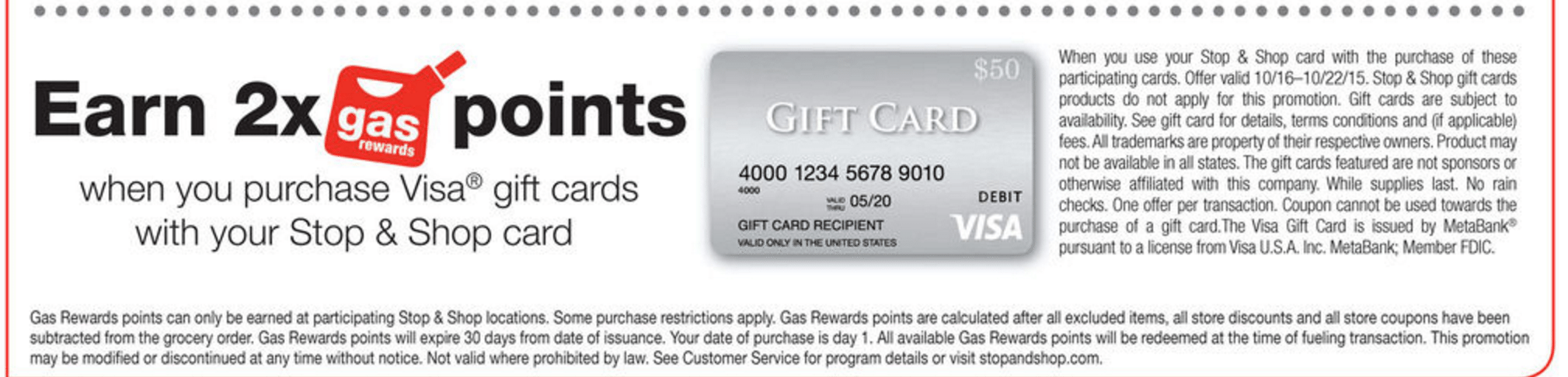 - Purchase Visa gift cards at Giant or Stop&Shop stores and receive 2x gas points on the purchase.