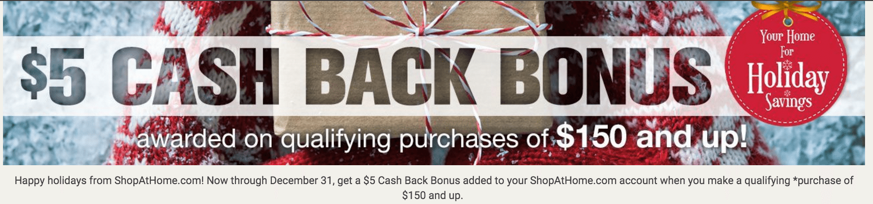 - Spend $150 or more via the Shopathome shopping portal and receive a $5 holiday bonus, besides the regular cashback you’ll earn.