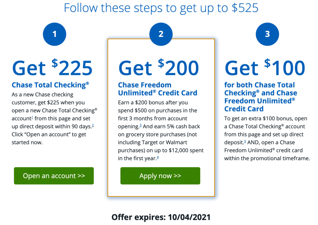 - Get $100 for both Chase Total Checking and Chase Freedom Unlimited Credit Card. To get an extra $100 bonus, open a Chase Total Checking account from this page and set up direct deposit. AND, open a Chase Freedom Unlimited credit card within the promotional timeframe.