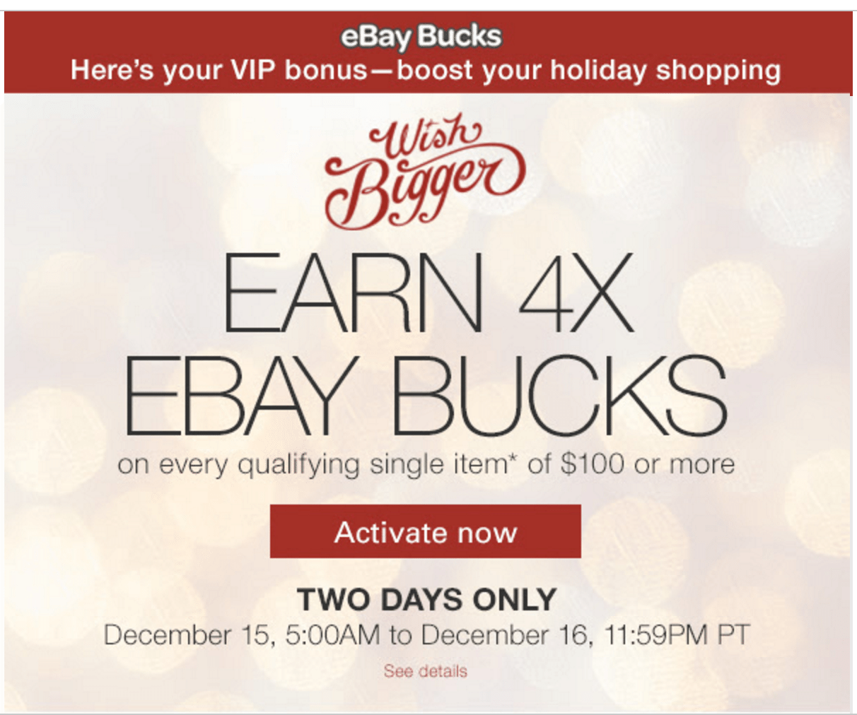 - Earn 4x eBay Bucks, or 8% back, on all purchases $100 or more.