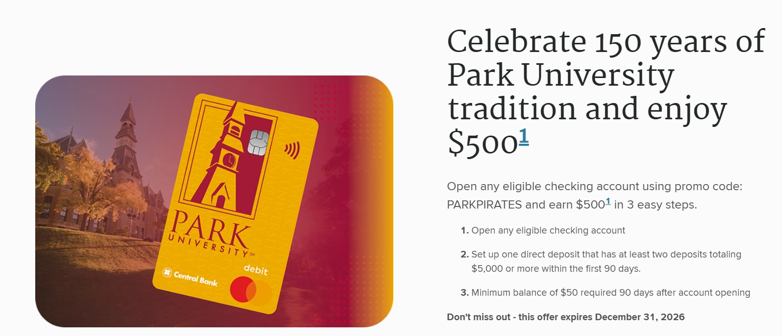 - Central Bank is offering a bonus of $500 when you open a new checking account (except free checking) with promo code PARKPIRATES
