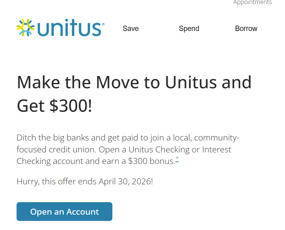 - Open a new Unitus Checking Account and receive a bonus of $100 when you meet the following requirements:
