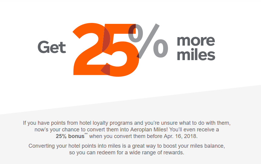 - Receive 25% more miles when you transfer hotel points into Aeroplan miles until April 16th, 2018