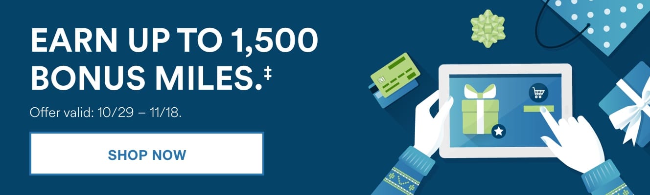 - ‡ During the “Holiday Bonus” offer, which runs from 10/29/18 through 11/18/18 at 11:59:59 pm ET (the “Bonus Period”), Member will receive a one-time bonus of up to 1,500 Mileage Plan TM bonus miles on qualifying purchases made through the Mileage Plan TM Shopping mall or from purchases made through Mileage Plan TM Shopping in-store offers.
