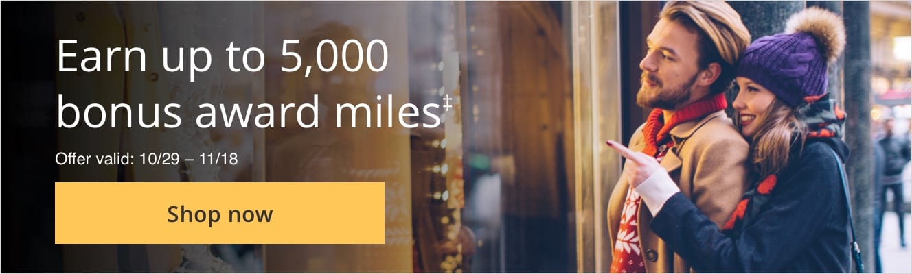 - ‡During the “Holiday Bonus” offer, which runs from 10/29/18 through 11/18/18 at 11:59:59 pm ET (the “Bonus Period”), Member will earn a one-time bonus of up to 5,000 MileagePlus® bonus award miles on qualifying purchases made through the MileagePlus® Shopping mall or from purchases made through MileagePlus® Shopping in-store offers.