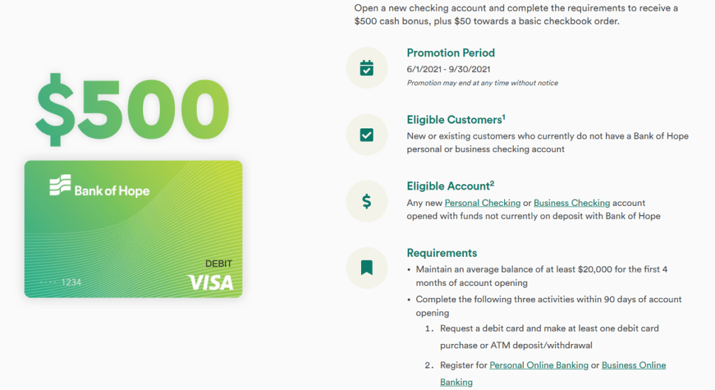 - Bank of Hope is offering a bonus of $500 when you open a new checking account and complete the following requirements: