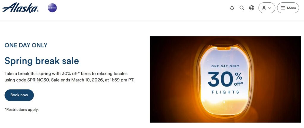 - Alaska Airlines is offering 30% off the base fare of some flights with promo code SPRING30