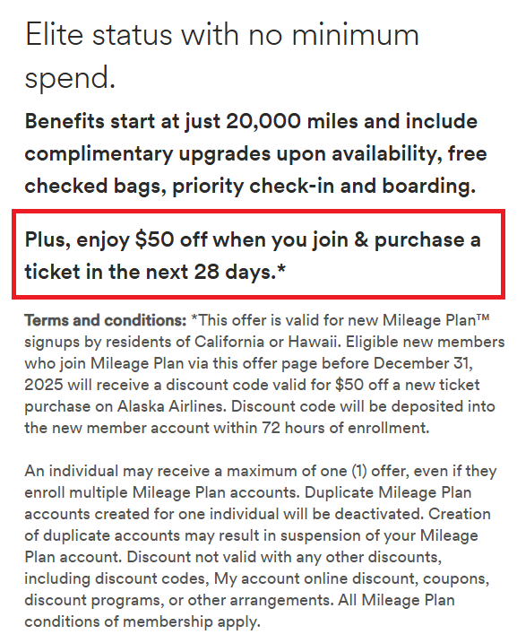 - Alaska Airlines is offering $25/$50 off flights when you join Alaska airlines. Flight purchase must be made within 28 days of enrollment. Valid until December 31, 2025