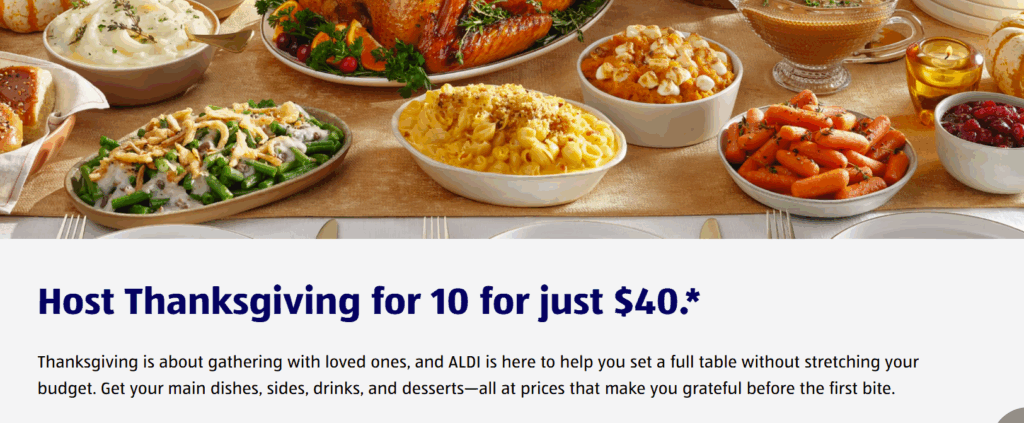 - Aldi is offering a 10 person thanksgiving meal for $40. This includes: