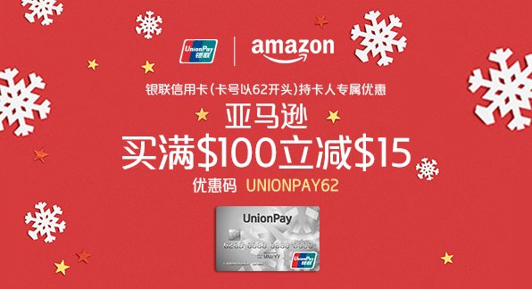 - UnionPay cardholders can get $15 off $100+ on Amazon by using a UnionPay card and entering the promo code UNIONPAY62