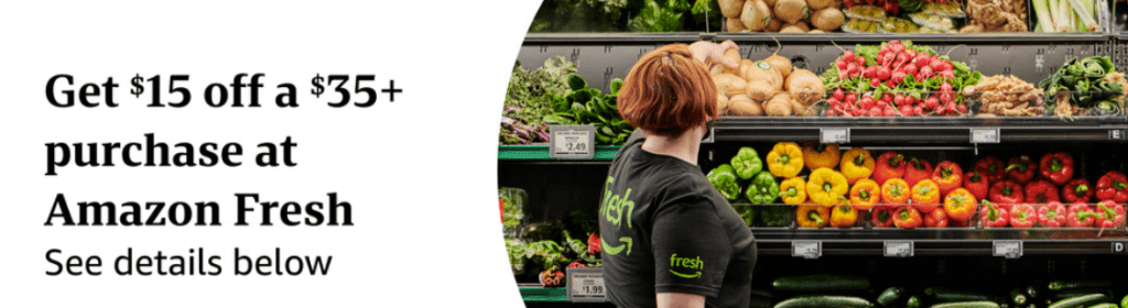 - Present QR code at checkout to receive $15 off your purchase of $35 or more at your local Amazon Fresh grocery store.