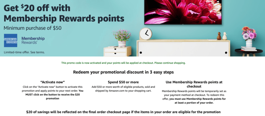 - Amazon is offering $20 off $50+ when you use at least 1 Membership Rewards points at checkout.