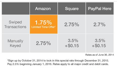 Amazon is offering an introductory fee of 1.75% processing fee for credit card swipes until the end of 2015. Beginning January 2016, the regular swipe-fee of 2.5% will be in effect. This rate is only available for those who sign up by the end of October 2014. The above rates are only for swiped payments; manually-keyed payments are 2.75%.