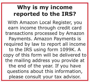 When you sign up for a Local Register account, Amazon states that they will file a 1099k for you. Many have pointed to the fact that Amazon writes clearly that they’ll only file a 1099k for those who (1) exceed 200 transactions, and (2) exceed $20,000 in gross payment volume. Accordingly, we’d be able to make use of Amazon Local – Â without tipping off the IRS – by keeping our totals under 200 transactions or under $20,000.