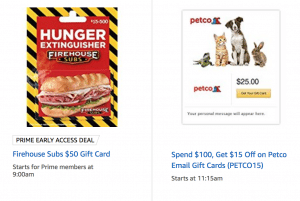 - $50 Firehouse Subs physical gift card for $40Â – begins 9 am ET for Prime members