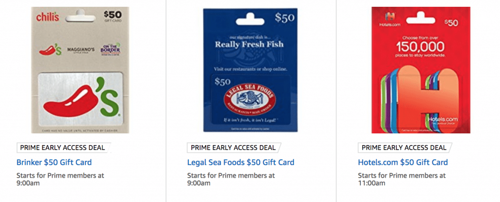- $50 Hotels.com physical gift card for ($42.50?) – begins at 11 am ET for Prime members