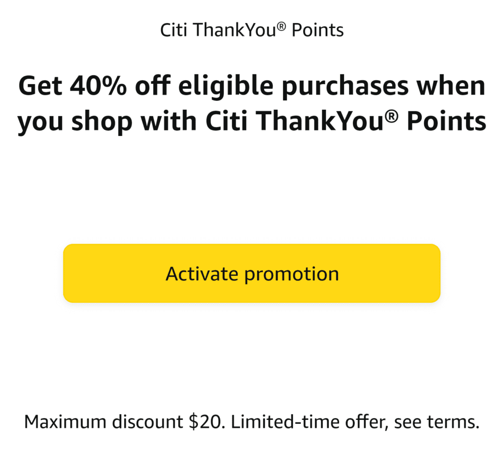 - Get 40% off products shipped and sold by Amazon when you use at least one Citi ThankYou point. Max discount $30