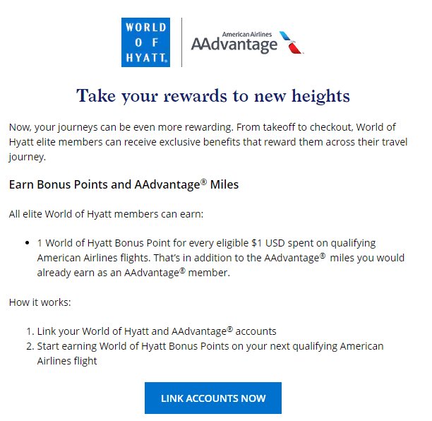 Original Post: American Airlines & Hyatt have announced a new partnership that will go live sometime later in 2019. Members of both programs will be able to earn additional points through this partnership.