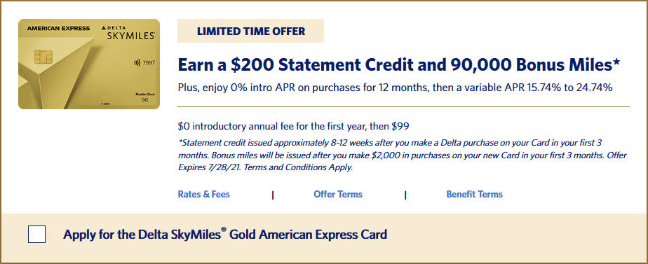 - American Express is offering a sign up bonus of 90,000 miles after $2,000 in spend within the first three months. You also get a $200 statement credit after your first Delta purchase within three months of account opening