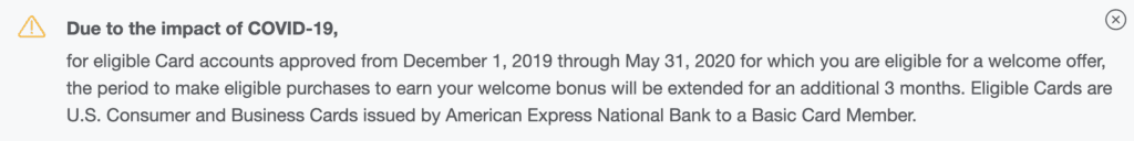 Due to the impact of COVID-19, for eligible Card accounts approved from December 1, 2019 through May 31, 2020 for which you are eligible for a welcome offer, the period to make eligible purchases to earn your welcome bonus will be extended for an additional 3 months. Eligible Cards are U.S. Consumer and Business Cards issued by American Express National Bank to a Basic Card Member.