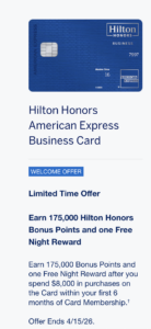 - Hilton Honors Business Card ($195 annual fee) – Earn 175,000 Bonus Points and one free night after you spend $8,000 in the first 6 months of Card Membership.