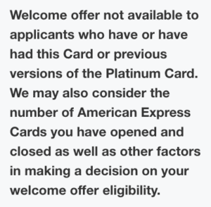 Welcome offer not available to applicants who have or have had this Card or previous versions of the Platinum Card. We may also consider the number of American Express Cards you have opened and closed as well as other factors in making a decision on your welcome offer eligibility.