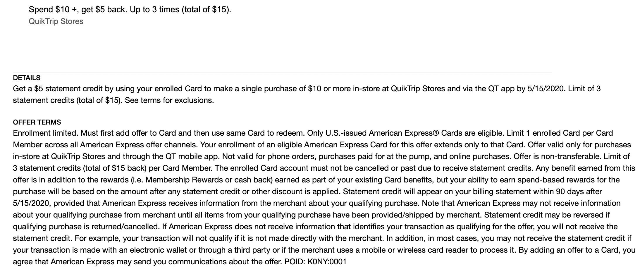 - Get a $5 statement credit by using your enrolled Card to make a single purchase of $10 or more in-store at QuikTrip Stores and via the QT app by 5/15/2020. Limit of 3 statement credits (total of $15). See terms for exclusions.