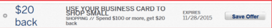 - Get a one-time $20 statement credit when you use your enrolled card to make a single purchase of $100 or more in-store at a small business on the Shop Small Map by 11/28/2015.