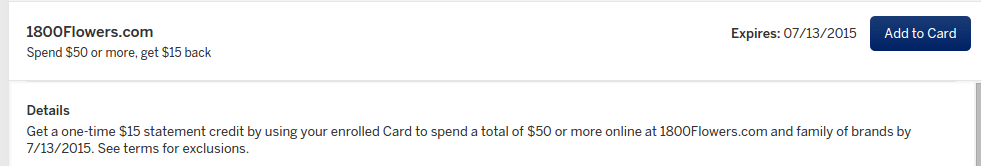 - Spend $50 at 1800-flowers or any of their affiliated stores with your registered Amex card and receive a $15 statement credit.