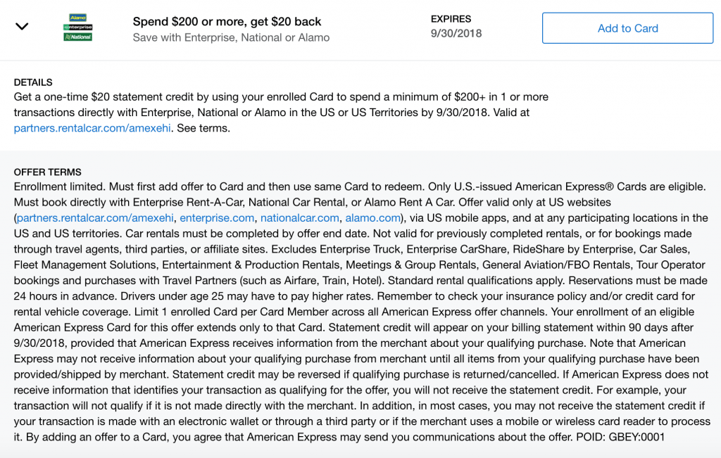- Get a $20 statement credit when spending $200 with a registered Amex card at Enterprise, National, or Alamo.