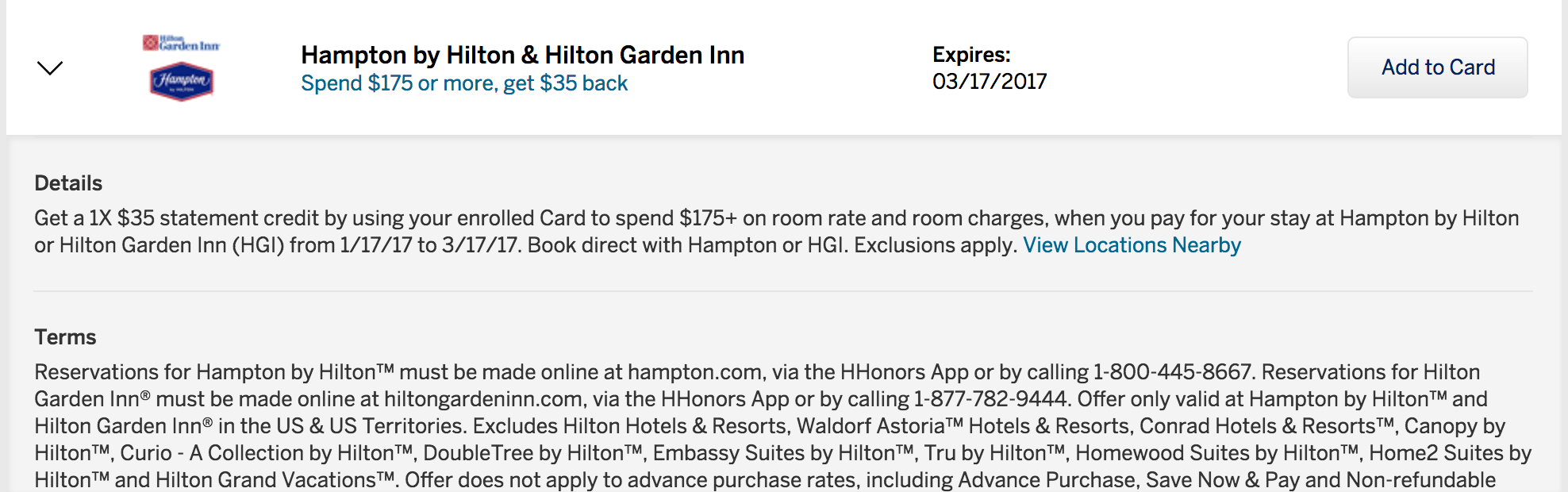 - Spend $175 at Hampton by Hilton or Hilton Garden Inn with an enrolled card and receive a $35 statement credit