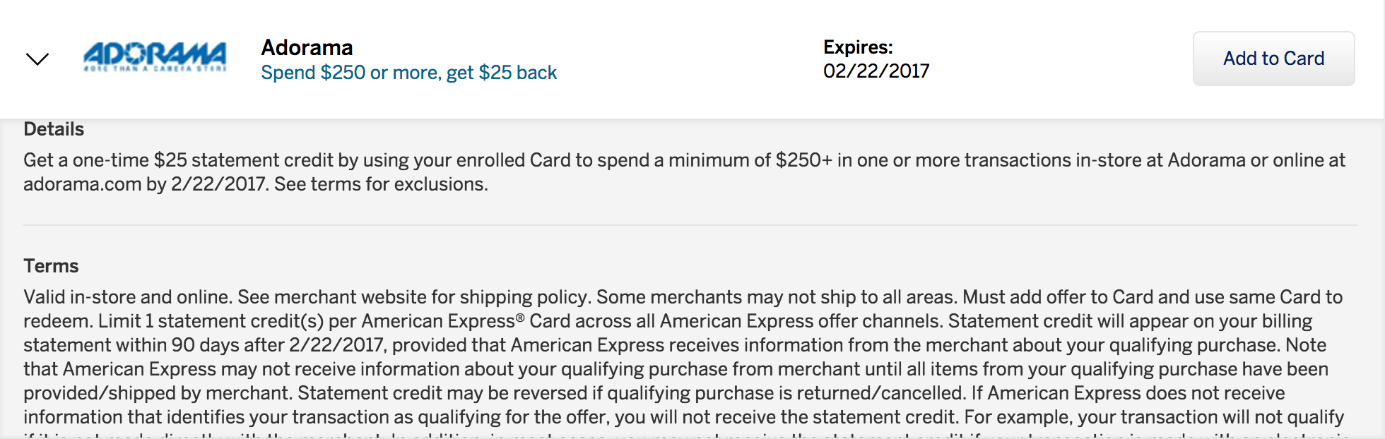 - Spend $250 at Adorma or adorama.com with a registered Amex card and get $25 back