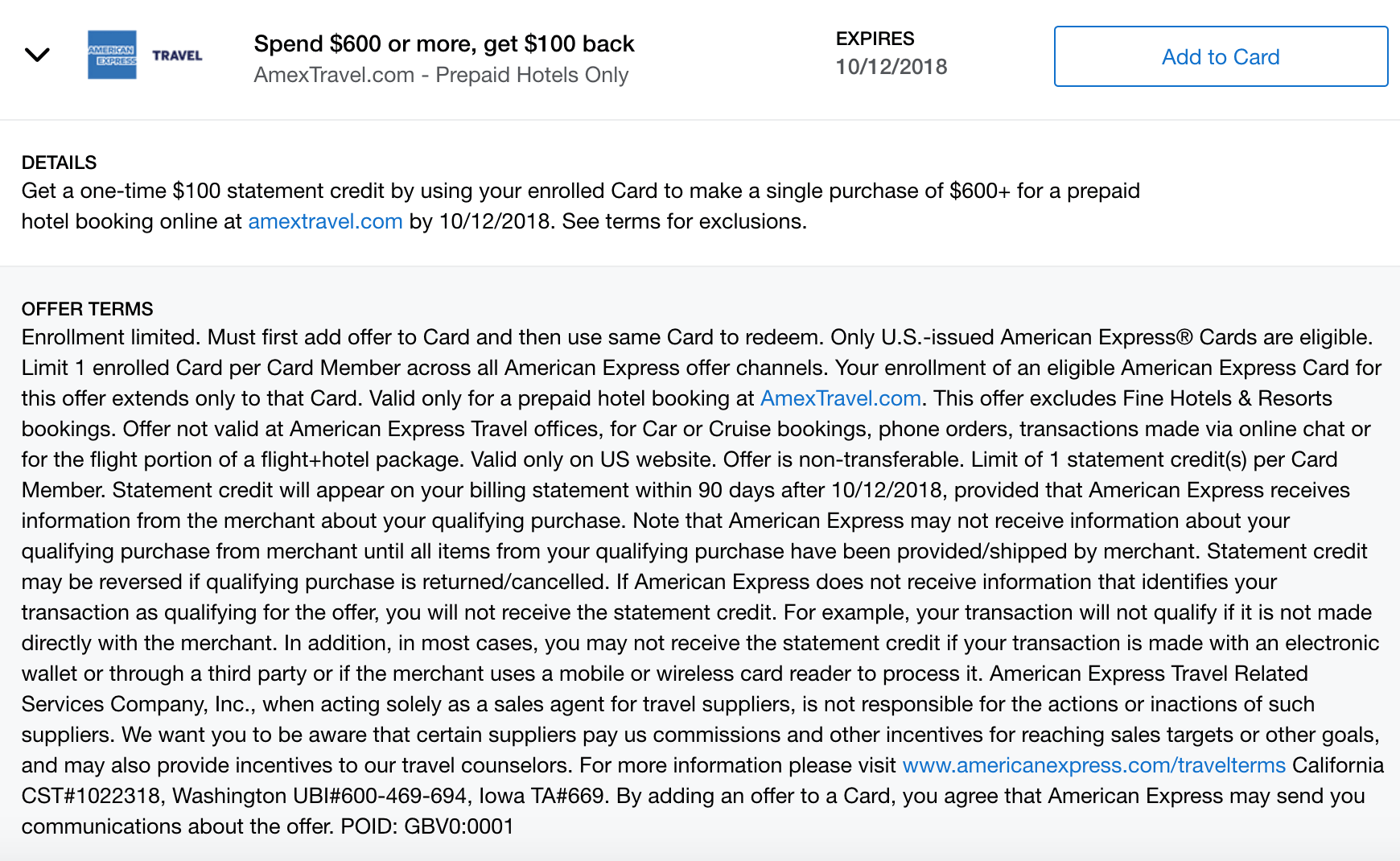 - Get a $100 statement credit by using your enrolled Card to make a single purchase of $600+ for a prepaid hotel booking online at amextravel.com.