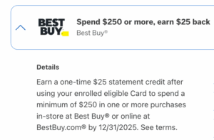 - Earn a one-time $25 statement credit after using your enrolled eligible Card to spend a minimum of $250 in one or more purchases in-store at Best Buy or online at BestBuy.com by 12/31/2025.