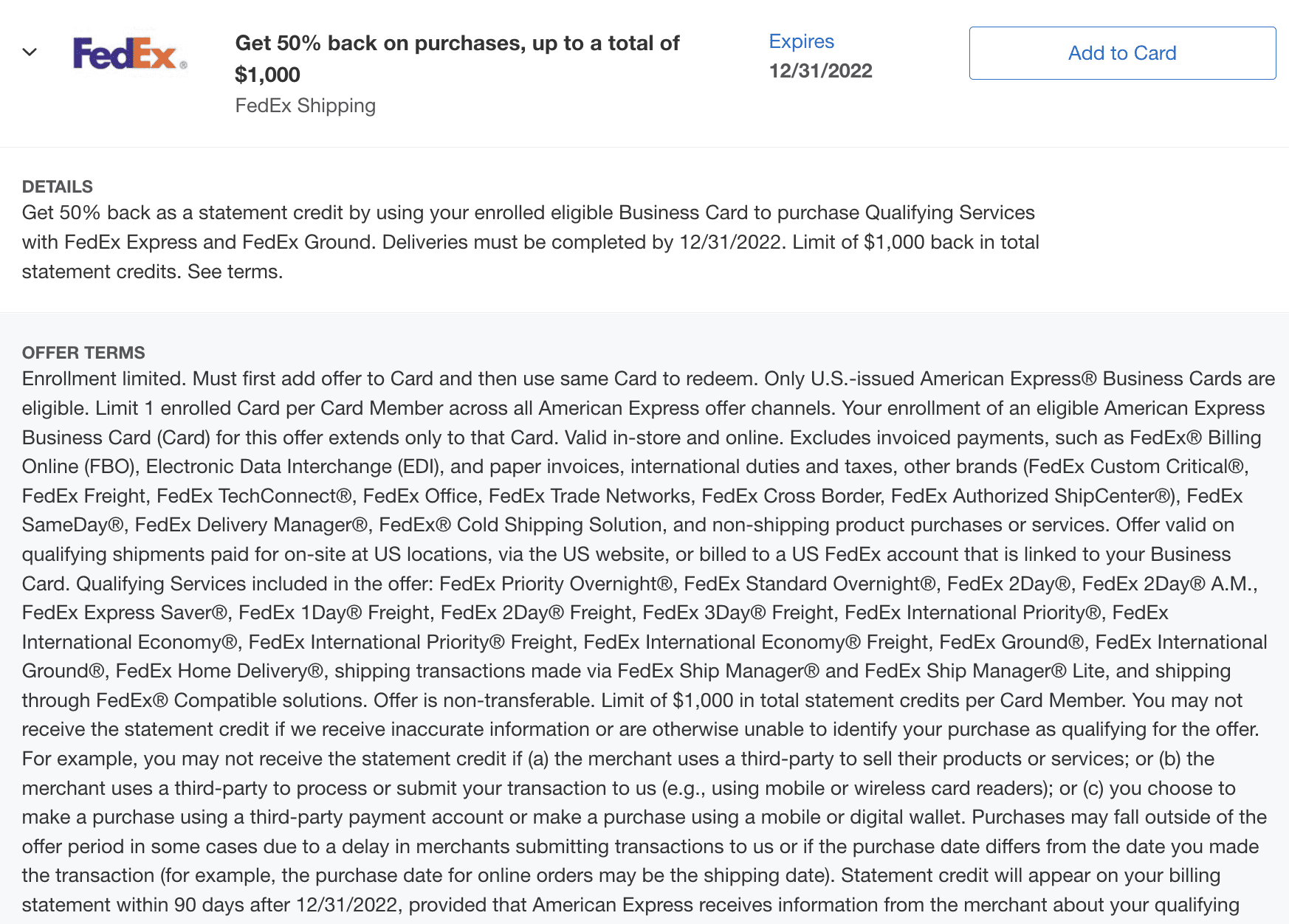 - Get 50% back as a statement credit by using your enrolled eligible Business Card to purchase Qualifying Services with FedEx Express and FedEx Ground. Deliveries must be completed by 12/31/2022. Limit of $1,000 back in total statement credits.Â