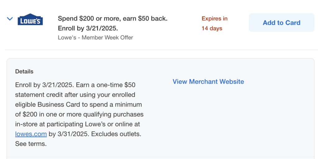 - Earn a one-time $50 statement credit after using your enrolled eligible Business Card to spend a minimum of $200 in one or more qualifying purchases in-store at participating Lowe’s or online at lowes.com by 3/31/2025.