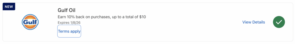 - Earn 10% back as a statement credit after using your enrolled eligible Card to make automotive fuel purchases paid for at the pump at Gulf Oil locations or through the Gulf Pay app by 1/8/2026. Limit of $10 back in total statement credits.