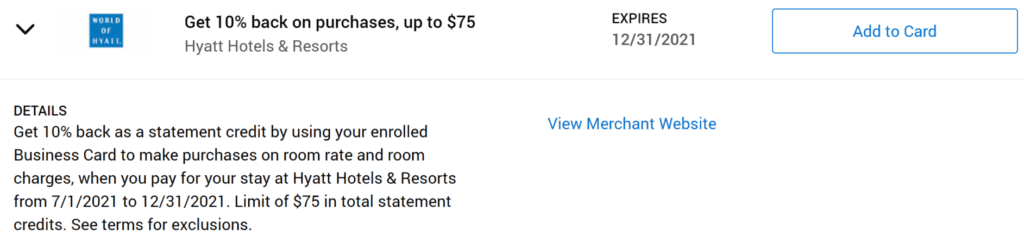 - Get 10% back as a statement credit by using your enrolled Business Card to make purchases om room rate and room charges, when you pay for your stay at Hyatt Hotels & Resorts from 7/1/21 to 12/31/21