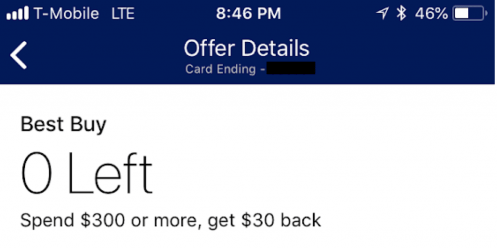 Related, reader Larry notes that the tracker is indicating the offer used up on a card that it was never used on, apparently due to the fact that it was used on a different card. Seemingly, Amex is enforcing the limit one-per person even on offers already saved. So, for example, if you have the $30 off $300 Best Buy offer already saved on multiple cards (from before the big August 1 change when Amex limited us to one per person), you’ll only be able to use it once. This change won’t matter for future offers, but could matter tremendously for a few terrific offers we have already have saved on many Amex cards.