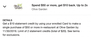 - Get a $10 statement credit by using your enrolled Card to make a single purchase of $50 or more in-restaurant at Olive Garden by 11/30/2019. Limit of 2 statement credits (total of $20).