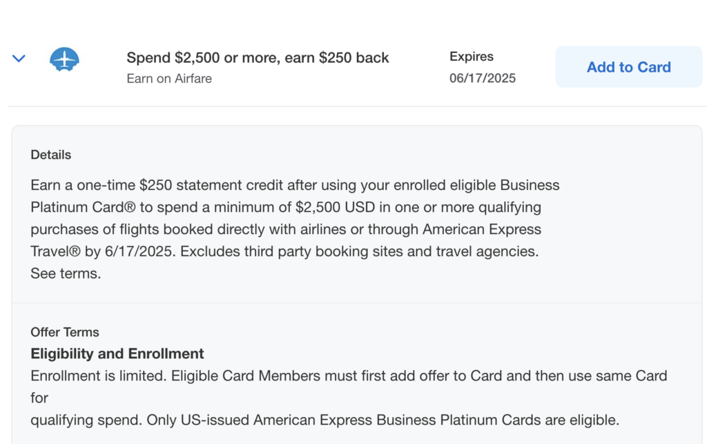 - Earn a one-time $250 statement credit after using your enrolled eligible Business Platinum Card to spend a minimum of $2,500 USD in one or more qualifying purchases of flights booked directly with airlines or through American Express Travel by 6/17/2025. Excludes third party booking sites and travel agencies. See terms.