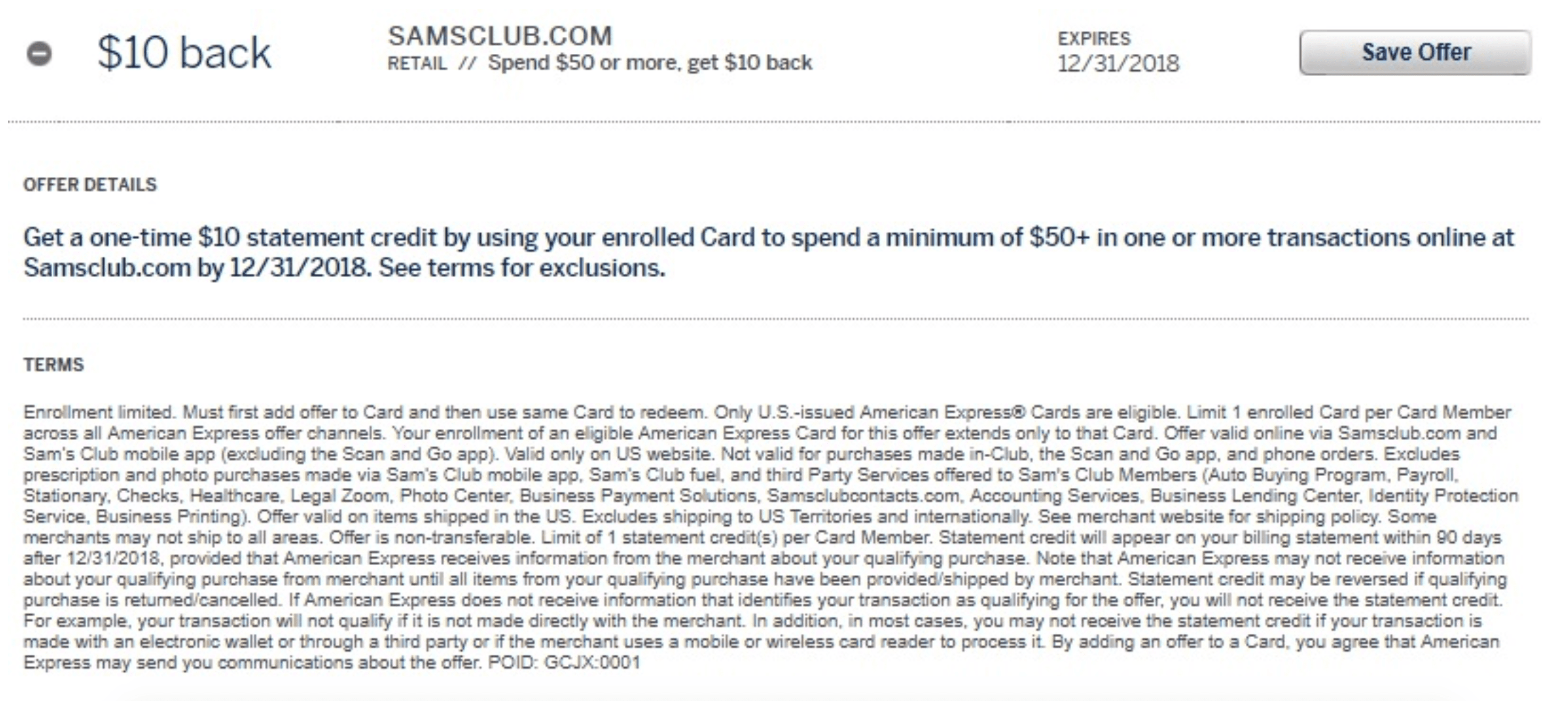 - Get a $10 statement credit by using your enrolled Card to spend a minimum of $50 in one or more transactions online at samsclub.com by 12/31/2018.
